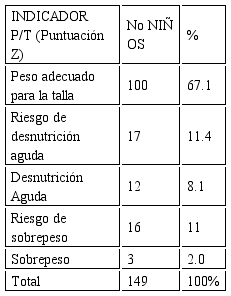 Peso para la Talla (P/T): para este indicador se encontró que el 67% de los niños presentan peso adecuado para la edad, el 11% están en riesgo de desnutrición y un 8% se encuentran en desnutrición aguda. En contraste el 10,7% presentan un riesgo de sobrepeso y un 2% se encuentran en sobrepeso, Tabla No 1.