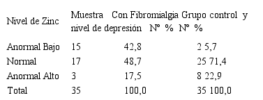 Al comparar los niveles de zinc entre los pacientes con fibromialgia en presencia de depresión y grupo control (Tabla 4), se obtuvo que en ambos grupos hubo una prevalencia del nivel normal 48,7% en pacientes con fibromialgia y en el grupo control 71,4%, habiendo mayores variaciones en el primero, siguiendo en orden de frecuencia el nivel anormal bajo 42,8%, mientras que la muestra de pacientes depresión prosiguió el nivel anormal alto 22,9%. En lo descrito por Bendich (2010), se obtuvo que los pacientes con depresión severa 60,7% el zinc es más bajo que en los controles con una proporción 3:1, y en pacientes con ansiedad moderada la proporción disminuye a 2.4:125.