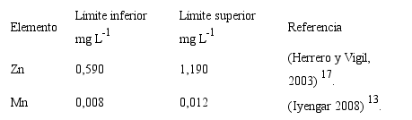 Para la determinación de los niveles de zinc sérico y de manganeso en sangre completa se empleó un Espectrómetro de Emisión Óptica con Plasma Inductivamente Acoplado, modelo 5300 DV. Se empleó el modo de vista axial del plasma y las longitudes de trabajo fueron: Zn 213.857 nm, y Mn 257.610 nm. Se utilizaron patrones certificados unielementales, marca AccuTraceTM Reference Standard de 1000 mg L-1 (Plasma emission Standard) de Mn y Zn. Para la curva de calibración de Zn se prepararon soluciones de trabajo en un rango de 0,010 mg L-1 a 2.500 mg L-1 y se aforaron con agua deionizada hasta un volumen final de 25 mL. Para la curva de calibración de Mn se prepararon soluciones de trabajo en un rango de 0,005 mg L-1 (5 µg L-1) a 0,030 mg L-1 (30µg L-1) y se aforaron con agua deionizada hasta un volumen final de 50 mL.