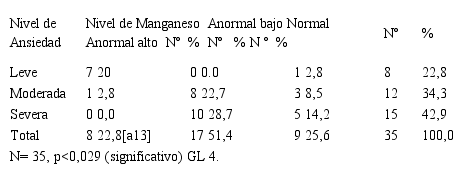 Al evaluar los niveles de manganeso en sangre a través de la técnica espectroscopia de emisión óptica inductivamente acoplado a un plasma en pacientes con fibromialgia (n=120), se demostró que el 50% de los pacientes estaban dentro de los límites normales y el 32,5 % estaba en un nivel anormal bajo. La cuantificación del nivel de manganeso en los pacientes con ansiedad (n=35), se mostró que 42,9% del total de los pacientes presentan nivel de ansiedad severa, y de este grupo el 28,7% presentaron un nivel de manganeso normal y un 14,2% anormal alto. El análisis estadístico mostró que existe una relación estadísticamente significativa entre las variables (p<0,05) (Tabla 1).