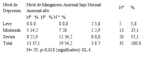 Al relacionar nivel de manganeso de los pacientes con depresión, se obtuvo que del total de pacientes, un 54,2%, presentan nivel de depresión severa. De este grupo el 34,2% mostro un nivel de manganeso normal mientras que un 22,9% estuvo con niveles anormal bajo. El análisis estadístico mostró que existe una relación estadísticamente significativa entre las variables, (p<0,05) (Tabla 2).