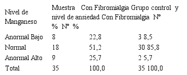 Al comparar los niveles de manganeso entre los pacientes con fibromialgia en presencia de ansiedad y grupo control solo con fibromialgia, se observó que el grupo de pacientes con nivel normal de manganeso se distribuyó en un 85,8% en el grupo control mientras que estuvo presente en el 51,2% de pacientes con fibromialgia + ansiedad. En el grupo de pacientes con niveles anormal alto se observó que el 25,7% pertenecía al grupo fibromialgia+ansiedad mientras que y el 22,8% presentaron niveles anomal bajo de manganeso (Tabla 3).