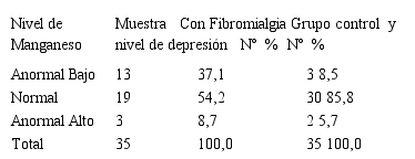 Al comparar los niveles de manganeso entre los pacientes con fibromialgia en presencia de depresión y grupo control con fibromialgia, se observó que el grupo de pacientes con nivel normal de manganeso se distribuyo en un 85,8% en el grupo control mientras que estuvo presente en el 54,2% de pacientes con fibromialgia + depresión. En el grupo de pacientes con niveles anormal alto se observó que el 8,7% pertenecía al grupo fibromialgia + depresión, mientras que y el 37,1% presentaron niveles de manganeso anormal bajo (Tabla 4).