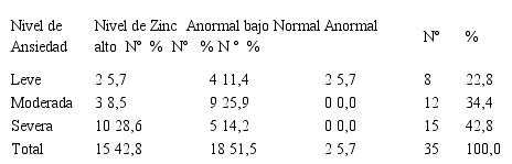 En los pacientes con ansiedad severa (42,8%), el nivel de zinc más común fue anormal bajo 28,6%. Datos que se correlacionan parcialmente con lo descrito por Porter y col. (2010), se encontró que en pacientes con niveles de ansiedad severa significativos 64,5% experimentaban bajos niveles de zinc hasta en un 41.2%, mientras que en pacientes con ansiedad moderada 28,7%, de igual modo persistía el déficit zinc hasta en un 19,1%24.