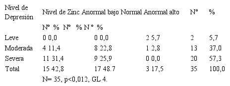 En los pacientes con depresión severa (57,3%), el nivel de zinc más común fue anormal bajo 31,4%. En la investigación de Porter y col. (2010), se encontró que en pacientes con niveles de depresión severa 61,2% experimentaban bajos niveles de zinc hasta en un 42,7%, mientras que en pacientes con depresión moderada 31,8%, de igual modo persistía el déficit zinc hasta en un 20,9%24.