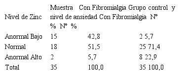 El grupo control obtuvo mayores niveles de zinc dentro de los límites normales con comparación a los pacientes con fibromialgia.