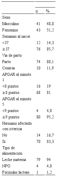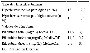 La prevalencia de hiperbilirrubinemia patológica fue 17,9%; con un promedio general de bilirrubina total 11,9±3,1 mg/dL (Tabla 1). Entre los pacientes con hiperbilirrubinemia hubo un leve predominio en el sexo femenino (51,2%; n=43), sólo un 14,3% (n=12) nació con <37 semanas de gestación, el parto fue la vía de nacimiento más frecuente (88,1%; n=74), la mayoría tuvo puntajes altos de APGAR, el 83,3% (n=70) tuvo un hermano afectado con ictericia y el 94% (n=79) recibía lactancia materna (Tabla 2).