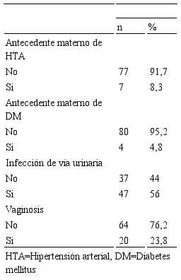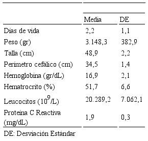 En la Tabla 3 se muestra el promedio de días de vida 2,2±1,1; peso 3.148,3±382,9 gramos; talla 48,9±2,2 cm; perímetro cefálico 34,5±1,4 cm y variables de laboratorio donde resaltan los leucocitos 20.289,2±7.062,1x109/L. Entre las características clínicas maternas destacan el antecedente de infección de vía urinaria con 56% (n=47) y vaginosis con 23,8% (n=20) (Tabla 4).