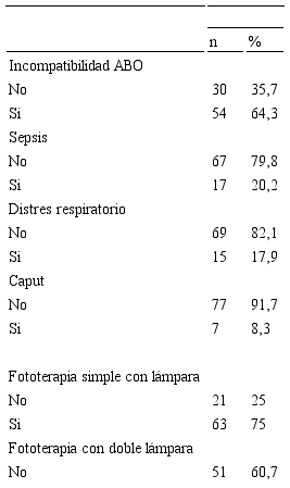 Finalmente, los diagnósticos más frecuentes durante la estancia intrahospitalaria de los neonatos fueron incompatibilidad ABO con 64,3% (n=54) y sepsis con 20,2% (n=17), mientras que un 75% (n=63) recibió fototerapia simple con lámpara y 39,3% (n=33) recibió fototerapia con lámpara doble, ninguno recibió exanguinotransfusión (Tabla 5).