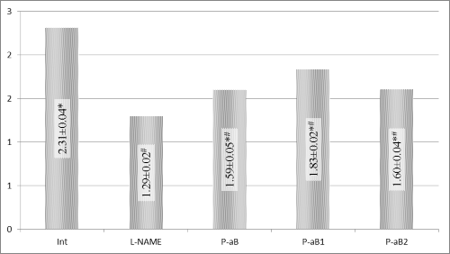 Administration of the studied innovative peptide P-αB1, that mimics the α-helix B of erythropoietin, presented a greatest endothelioprotective effect. The coefficient of endothelial dysfunction decreased to 1.80±0.15, and microcirculation rose to 378.1±9.45 PUn, however the values did not reach basal levels (Table 1). It should be noted that peptides P-αB1 administration reduced blood pressure values to those control animals.