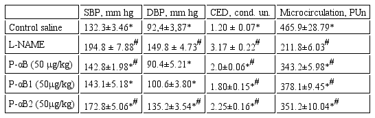 SBP, DBP - systolic and diastolic blood pressure (mmHg) CED - coefficient of endothelial dysfunction (cond. un.); PUn - perfusion units; #p<0.05 compared with a group of intact animals; *p<0.05 compared with the L-NAME group.