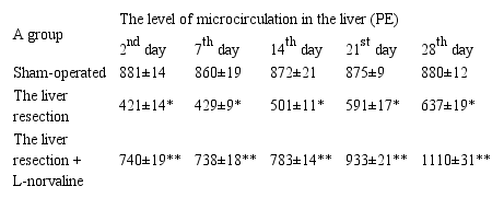 After liver resection, the rate drops by 50% and remains unchanged for the first 14 days. By 21 days, the rate starts to rise, however, on the 28th day, the average microcirculation level in the resected liver of rats is lower than that of intact animals (р<0.05). L-norvaline administration contributed to the preservation of blood flow in the cut liver at a fairly high level (the rate drops by 15%) and recovered it for up to 21 days after resection.