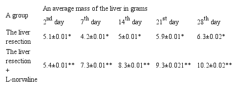 In a group of animals with liver resection, 2 days after the liver mass increased when compared with the mass immediately after resection almost doubled. By the 7th day, it decreases slightly, then it started to increase, but by the 28th day after resection, the liver mass was slightly lower than that of intact rats. In the group of animals with liver resection L-norvaline administration induced an increase of liver mass, indeed in two days increases exactly two times, continuing to grow and reaching mass in intact animals by 21 days (р<0.001).