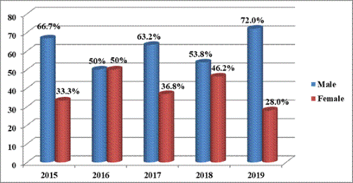 In addition, our data show that there was an increase in the number of cases of suicide from nine cases in Babylon during 2015 to 25 cases in 2019, probably this may be due to the increasing level of depression among people, which occur as a result of their social, economic and political problems including the absence of work, political un stability, and love problems. Another factor that may increase depression in younger age groups, especially among men, is the elevated level of substance and drug abuse among the younger age group, which is either due to depression or drug abuse cause depression.