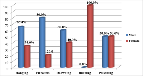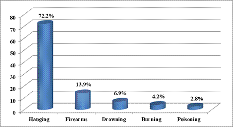 Regarding the distribution of suicidal death according to methods of suicide, in the current study, the most common method of suicide was hanging which represent about three quarters (72.2%) of suicidal death (52 cases), while firearms used only by 10 cases which represent (13.9%), drowning used by only 5 cases which represent (9.6%) of total cases. Burning is used by only 3 female cases which represent 4.2% and the use of poisons as a method of suicide by 2 cases (2.8%) (figure 2).