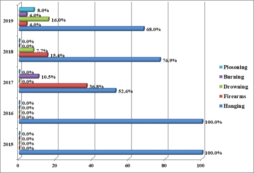 There was no significant association between gender of suicidal victim and method of suicide (P=0.133), the majority of those victims using hanging as a method of suicide (65.4%) were male, and the majority of those victims using firearms as a method of suicide (80.0%) were male, the majority of those victims using drowning as the method of suicide (60.0%) were male, while all those victim use burning for suicide were female. Using poison as a method of suicide was equal between males and females. Figure 5 shows the association between the year of suicide and the method of suicide.