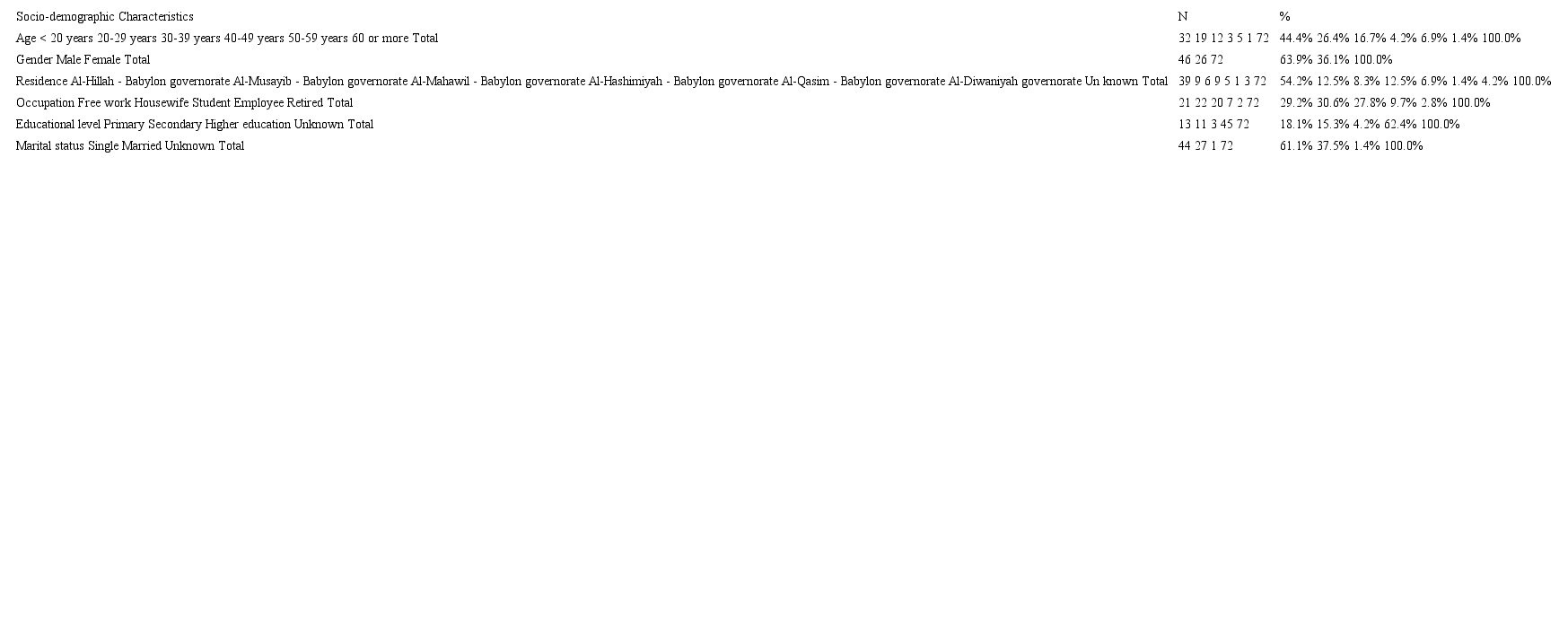 The current study includes seventy-two suicidal deaths during five years of the collected data, from January 2015 to the end of December 2019. The mean age of suicidal victims was 25.52 ± 12.51 years, the younger one was 11 years and the older one was 68. From all, 32 cases (44.4%) were below 20 years and 31 cases (43.1%) were between 20-39 years. Most of the victims were male; being 46 cases (63.9%), most of them 39 cases (54.2%) were from the Hilla, located at the center of Babylon. More than half of the 43 cases (59.8%) were either a free worker or housewife. More than a quarter of them were students, 20 cases (27.8%); and 24 cases (33.4%) had primary or secondary level of education, 44 cases (61.1%) of them were unmarried (Table 1).