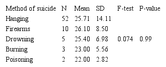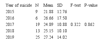 In Table 2 is shown the mean age of suicidal death according to the year of suicide. There were no significant differences between means of the age of suicidal death according to the year of suicide (F=0.322, P=0.862). The highest mean age was during 2019 was 27.24 years, the lowest mean age was during 2017 (24.89). Table 3 shows the mean age of suicidal death according to the method of suicide including (hanging, firearm, drowning, burning, and poisoning).