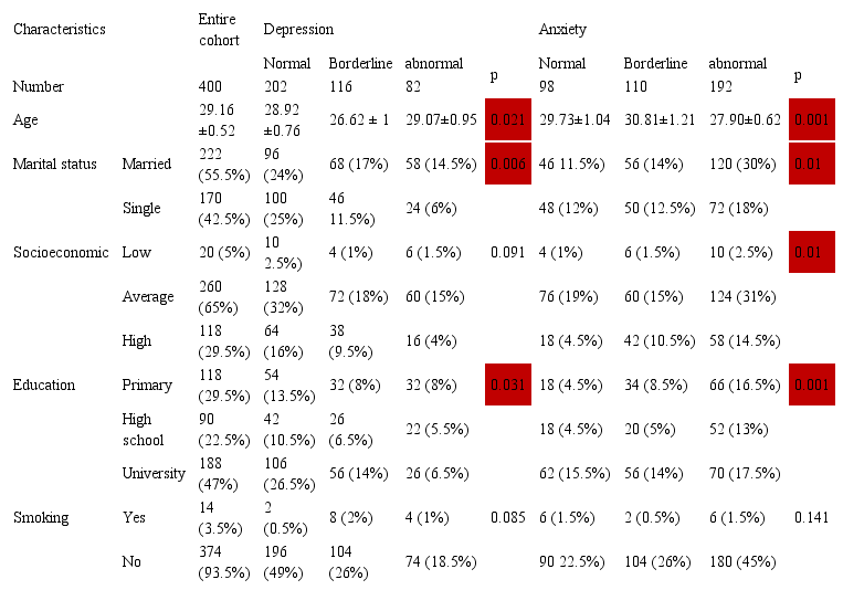 A total 400 women were enrolled in the study, whith a mean age of 29.16 years. Of the total participant 55.5% were married and 42.5% were single. 47% of the participants had university educational level, and about two-thirds of the sample was of the middle class (65%). Demographic, The percentages of anxiety status in the study sample were 48% abnormal, 27.50% borderline and 24.50% had no anxiety (Figure 1). Regarding depression, the highest percentage was normal (51%) while 20% had depressive symptoms and the remaining women had borderline status (29%).
