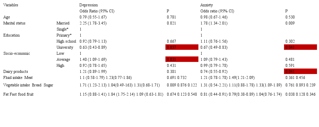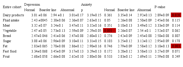 Results: a healthy diet that was high in vegetable content decrease depressive symptoms (P=0.009) and was not associated with anxiety (P=0.761), while high fat intake increased anxiety (P=0.038) and there was no relation with depression (P=0.674). For diary products intake the results were, P=0.381 for depression and P=0.041 for anxiety).