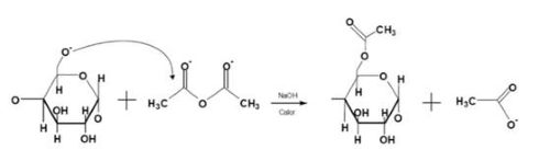 Un tipo de esterificación de almidón muy común es la acetilación, que implica la introducción de grupos acetilos (-COCH3) más hidrofóbicos a lo largo de la cadena del almidón2 (Figura 3).