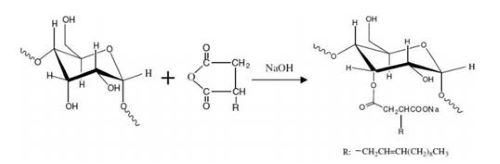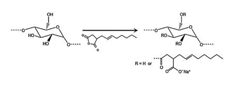 En la modificación química de almidón por medio de Octenil Succínico Anhidro (OSA), ocurre la adición de grupos bifuncionales hidrofílicos e hidrofóbicos a la molécula. Los grupos OH disponibles en el almidón son atacados y se le quita un protón para posteriormente formarse un éster con el grupo OSA adicionado36 (Figura 6).