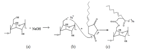 Los pasos de la reacción de succinatación del almidón: a) Formación de la sal de almidón; b) Ataque de la sal de almidón sobre el anhídrido succínico; c) Producto final (Figura 5).