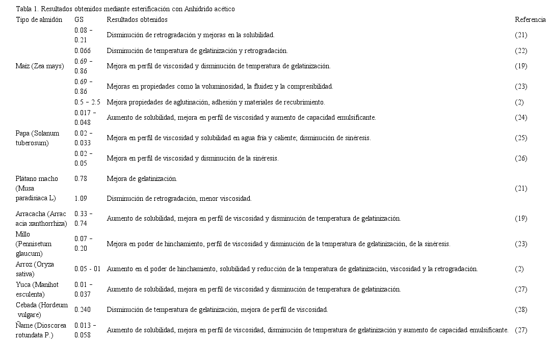 La incorporación de grupos acetilos interrumpe la linealidad de la amilosa o segmentos de amilopectina, lo que provoca la re-asociación de las cadenas de almidón hacia una estructura ordenada luego de la gelatinización y enfriado del producto (retrogradación). Este tipo de esterificación proporciona a las moléculas de almidón termo plasticidad, hidrofobicidad y compatibilidad con otros aditivos2 (Tabla 1).