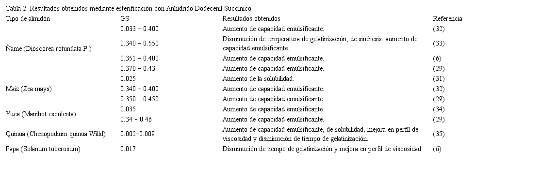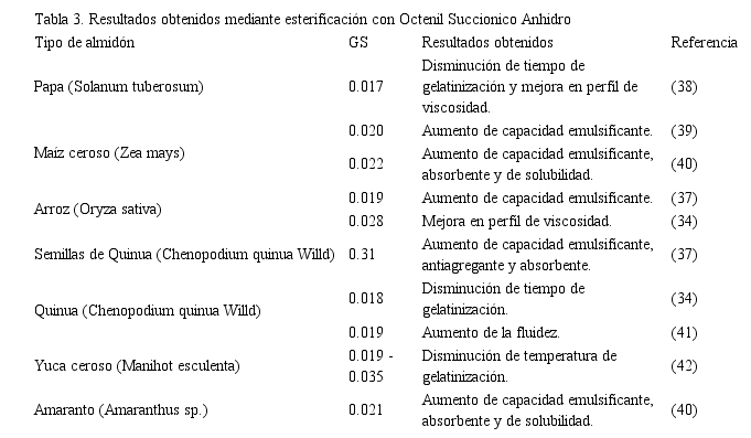Los almidones sustituidos de interés industrial son principalmente producidos por reacciones de esterificación, siendo esta la reacción que involucra la sustitución de grupos hidroxilos por grupos éster. El grado de sustitución está relacionado con la modificación química e indica el promedio del número de sustituciones por unidad de anhidroglucosa en el almidón. El máximo grado de sustitución (GS) es 3 debido a que se presentan tres grupos hidroxilo disponibles por unidad de anhidroglucosa8. Los almidones pueden ser esterificados usando diferentes tipos de ácidos inorgánicos y orgánicos, anhídridos y cloruros de acilos9.