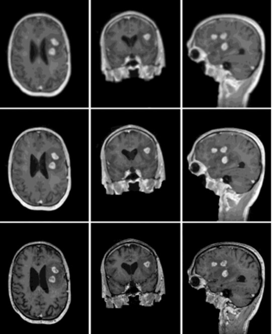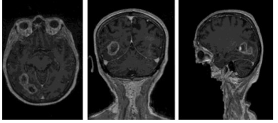 Para el desarrollo del presente trabajo se utilizó la colección de datos de pacientes con GB conocida como: Base de Datos de Imágenes de Referencia para Evaluar la Respuesta a la Terapia (RIDER, por sus siglas en inglés), empleándose únicamente un grupo de iRM de 11 pacientes adquiridos con el protocolo de contraste mejorado tridimensional (3-D) de disparo rápido de ángulo bajo (3-D FLASH) en el plano sagital después de la administración de Magnevist. Estas corresponden con imágenes tridimensionales de 256x256 con tamaño de voxel isotrópico de 1 mm. La Figura 1 muestra las vistas axial, sagital y coronal de un paciente con GB de la colección de datos RIDER adquirida usando el protocolo 3-D FLASH. El conjunto de datos debe ser re-escalado en intensidad para representar las intensidades en 12 bits, en las que el negro corresponde a 0 y el blanco a 4095. La colección de datos se obtiene con ayuda de la aplicación NBIA Data Retriever 20148.