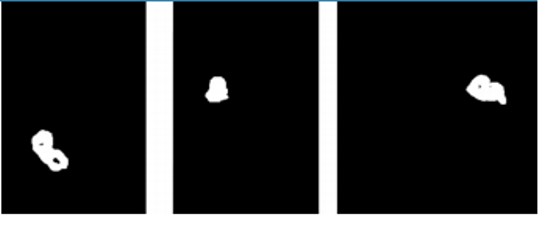 La Figura 3 muestra los resultados obtenidos después de aplicar el procedimiento de segmentación propuesto, para ilustrar, el tumor se presenta en blanco. Las imágenes bidimensionales (2-D) que se muestran en la Figura 3 representan los resultados obtenidos al aplicar el método de segmentación a la imagen 3-D realzada con el filtro de mediana (planos axial, coronal y sagital) que se muestra en la Figura 1. Se puede observar una región interna del tumor que no es detectada por el algoritmo de agrupamiento, sin embargo, el algoritmo de cubos marchantes permitirá encontrar las iso-superficies asociadas con el contorno externo de la lesión.