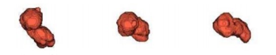 Los resultados cualitativos de la etapa de visualización se muestran en la Figura 4, en la cual el tumor cerebral detectado se muestra en rojo. Estas figuras muestran las paredes externas de la neoplasia maligna reconstruida utilizando la técnica de renderizado de iso-superficies basada en cubos marchantes. Cada una de las imágenes 3-D mostradas en la Figura 4 se corresponde con las vistas, con una angulación que define los planos axial, coronal y sagital del tumor, respectivamente.