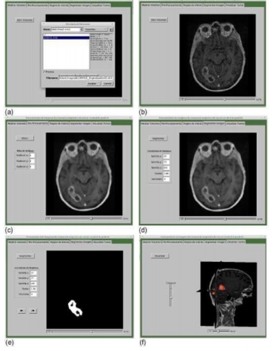 La Figura 5.b muestra la vista axial de la imagen MHD seleccionada, el rebanador permite moverse sobre todos los planos axiales del volumen de iRM. Por su parte, la Figura 5.c muestra la pestaña en la cual se implanta la etapa de preprocesamiento, en la misma se pueden observar los widgets de entrada de texto que sirven para ingresar los parámetros óptimos del filtro de mediana. Tales parámetros se refieren al tamaño de la vecindad que tendrá el filtro de mediana en cada dirección; por defecto, cada una de estas entradas tiene valor de 4. Esta pestaña también considera un rebanador para mostrar todos los cortes axiales de la imagen obtenida una vez que se realiza clic sobre el botón “Filtrar”. La Figura 5.d muestra la pestaña de la GUI asociada con la etapa de segmentación, se consideran widgets de entrada de texto para configurar los parámetros requeridos por la clase de ITK para realizar la segmentación, como lo son, las coordenadas del punto semilla, el multiplicador y el tamaño de la vecindad 3-D. Las coordenadas del punto semilla son establecidas por medio de la interacción con el ratón sobre la imagen del plano axial, cada vez que se realiza un clic sobre la imagen, se actualizan las coordenadas del punto semilla en los respectivos widgets de entrada de texto. El resultado del proceso de segmentación, una vez que se activa tal proceso al seleccionar el botón “Segmentar”, se presenta en la Figura 5.e. En esta pestaña, una vez se realiza la segmentación del volumen iRM filtrado, se muestran botones asociados a las funciones deshacer y rehacer la segmentación actual. Esto permite deshacer la segmentación para seleccionar un nuevo punto semilla o modificar los parámetros de la clase ITK, esta pestaña también considera un rebanador para visualizar los cortes segmentados.