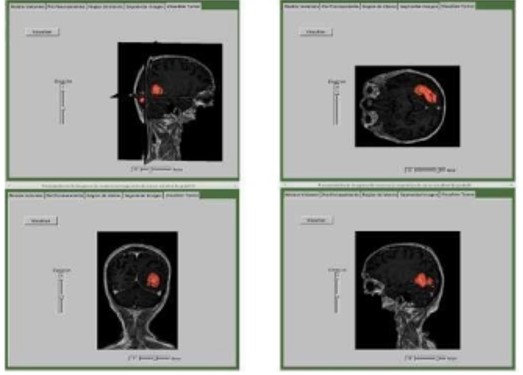 Por último, la Figura 5.f muestra el tumor segmentado ubicado sobre los planos axial, coronal y sagital localizados por las coordenadas del punto semilla. Se implantan dos slicers que permiten modificar la angulación del volumen MRI en cuanto a rotación y elevación. La Figura 6 muestra el tumor segmentado con los planos ortogonales en diferentes ángulos de rotación y elevación.