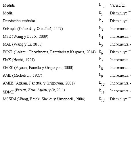 i el vector de pesos cuyos componentes toman valores −1 o +1. wi es +1 si el valor de la métrica correspondiente calculada para la imagen mejorada tiene la variación esperada (disminuir/ aumentar ) con respecto a la imagen original.