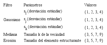 El conjunto de valores de variación de parámetros de los filtros establece un máximo de 72 configuraciones distintas. Para el filtro Gaussiano se generan 64 configuraciones dadas por la combinación de los valores asumidos de las tres desviaciones estándar; con respecto al filtro de mediana se presentan 4 configuraciones y para el filtro de erosión también se tienen 4 configuraciones. El procedimiento propuesto para evaluar la capacidad de un conjunto de filtros de suavizado para disminuir el impacto de los artefactos y el ruido en el análisis de iRM consta de los siguientes pasos: