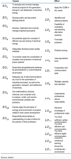 Table 1. List of causes (educational objectives - EO) and effects (learning outcomes - LO).