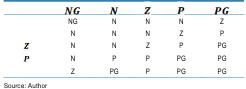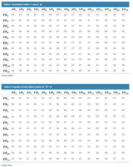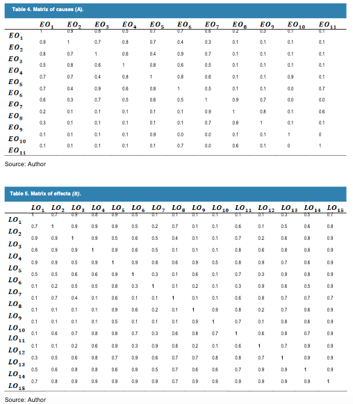 Once the matrices [M], [A] and [B], are constructed, the direct and indirect incidences are established; that is, incidences in which, at the same time, some interposed cause or effect intervenes. The composition or the max-min convolution of the three matrices was done, by using the array with the fuzzy rules.