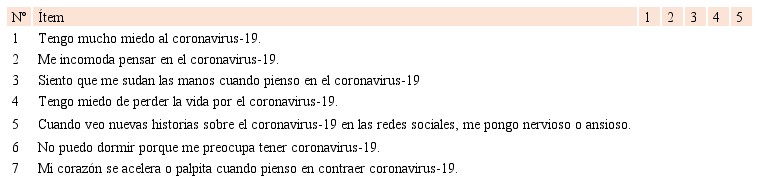 El puntaje mínimo posible para cada pregunta es 1, y el máximo es 5. Un puntaje total se calcula sumando el puntaje de cada ítem (de 7 a 35). Cuanto mayor es el puntaje, mayor es el miedo al cororonavirus-19.
