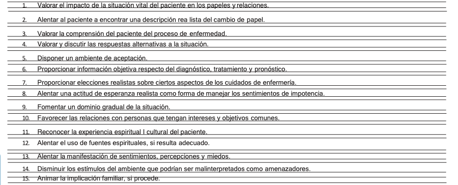 Para llegar a esta finalidad se debe dirigir a una intervención enfocada a: Aumentar el afrontamiento para ayudar al paciente a adaptarse a los factores estresantes, cambios o amenazas perceptibles que interfieran en el cumplimiento de las exigencias y papeles de la vida cotidiana con las siguientes actividades (Apéndice B):