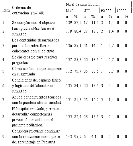 El 97,9% de los estudiantes esta satisfechos y muy satisfechos con la oportunidad de desarrollar competencias del hacer previas a la práctica clínica y el 100% de los asistentes considera relevante dar continuidad con la simulación clínica en Pediatria (Tabla 1). Entre el 0,7 al 2% de los participantes tuvo poca satisfacción con la actividad y ningún estudiante se mostro insatisfecho. Los facilitadores evidenciaron que la mayoría de los estudiantes se apropian de su conocimiento, revisan previamente el tema y participan activamente de la simulación.