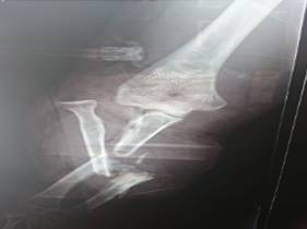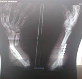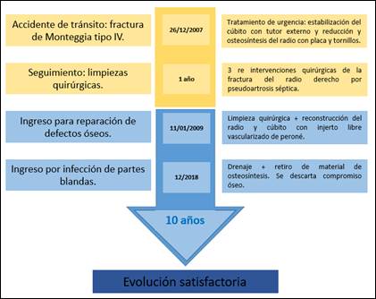 Hallazgos clínicos: paciente en calidad de copiloto de un automóvil sufrió un accidente de tránsito el 26 de diciembre de 2007, en el cual la puerta del vehículo atrapó su antebrazo derecho, ocasionando una fractura luxación de Monteggia tipo IV expuesta, con defectos de la diáfisis del cúbito tipo III-C de Bustillo y Anderson. Recibió tratamiento quirúrgico de urgencia con estabilización del cúbito con un tutor externo y reducción y osteosíntesis del radio con placa y tornillos. Debido al proceso séptico recibió tratamientos de limpieza de herida por un año y reintervención de la fractura del radio derecho en tres ocasiones por pseudoartrosis séptica.