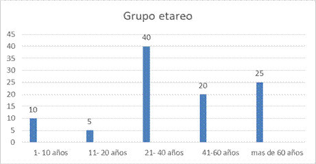 De los 20 casos estudiados, 70% (n=14) fueron del sexo masculino y 30 % (n=6) del sexo femenino. La edad promedio de los pacientes fue de 41,05años. En cuanto al grupo etario 2 pacientes (10%) tuvieron de 1 a 10 años, 1 paciente (5%) tuvieron entre 11 y 20 años, 8 (40%) pacientes tuvieron entre 21 y 40 años, 4 pacientes (20%) tuvieron entre 41 y 60 años; y, por ultimo 5 personas (25%) más de 60 años (Figura 1). El paciente más joven tuvo 6 años y el de mayor edad 77 años.