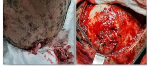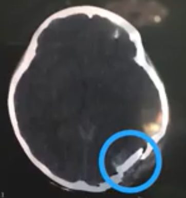 Figura 3. TCE abierto por proyectil de arma de Fuego, Fractura con hundimiento en región parietal derecha.