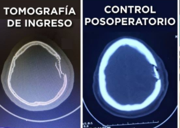 En el 100% de los casos se realizó esquirlectomía con levantamiento de la fractura y limpieza quirúrgica; en 14 casos (70%) se realizó reconstrucción craneal (craneoplastía) con hueso autólogo (figura 3), en 2 pacientes (10%) se realizó craneoplastía con malla de titanio; y, en 4 casos (20%) en primera intención no se corrigió el defecto óseo por contaminación macroscópica de la herida, en estos casos se difirió la craneoplastía.