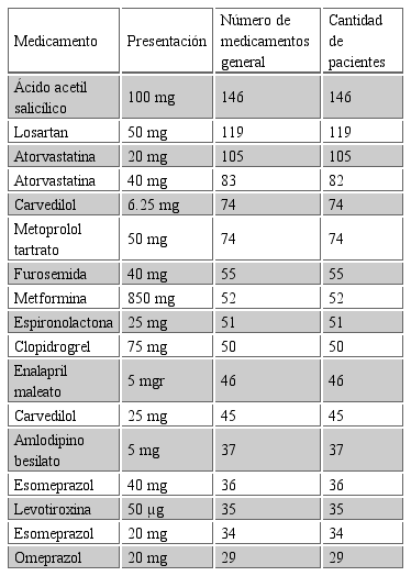 Los betabloqueadores, los antiagregantes plaquetarios, las estatinas, los bloqueadores del receptor de la angiotensina II y los diuréticos fueron los grupos terapéuticos más informados (48%) (Tabla 1).