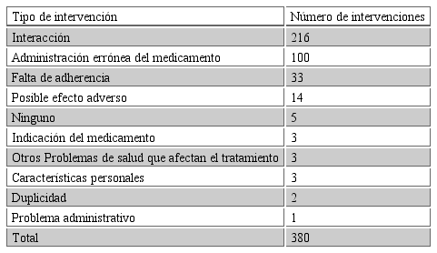 54 pacientes recibían entre 2 y 4 medicamentos, 124 pacientes entre 5 y 7 medicamentos, 91 pacientes entre 8 y 14 medicamentos. De los cuales se identificó 1 contraindicación, 67 interacciones medicamentosas mayores (severas), 775 interacciones medicamentosas moderadas y 58 interacciones medicamentosas menores (leves); para un total de 901 interacciones medicamentosas, que son consideradas uno de los factores de influencia en la adherencia a la terapia por su potencial de generar molestias en los pacientes, así como posibles resultados negativos de la medicación.