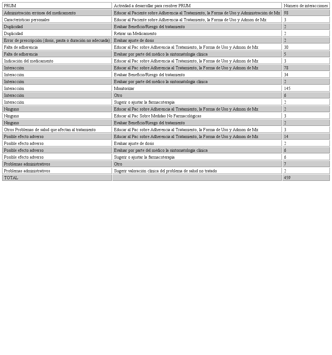 Se informaron un total de 484 PRUM y 184 RNM. Los PRUM de tipo interacción medicamentosa representaron el 56% y el 10% se caracterizó como evitable; los PRUM de tipo administración errónea del medicamento representaron el 20,7% y el 100% se caracterizó como evitable. Los RNM de tipo inseguridad no cuantitativa representaron el 30,6% y el 5% se caracterizó como evitable. El 93,6% presentó una adherencia objetiva al tratamiento a la última consulta y solo el 6,4% continuó siendo no adherente (Tablas 2, 3, 4 y 5).