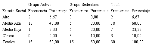 Al determinar el estrato social, se puede observar en la Tabla 1 que el grupo de mujeres activo físicamente, sus integrantes poseen un estrato social medio alto (40%), esto difiere en las mujeres sedentarias, las cuales se encuentras distribuidas entre media alto y medio bajo (20%), en este grupo existe un 10% de la clase obrera.