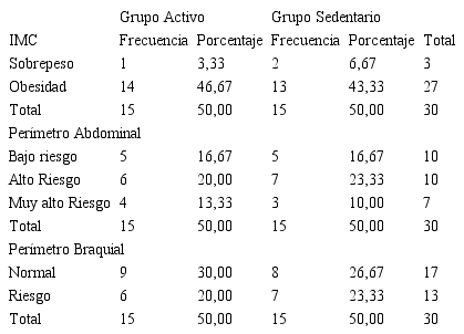 En la Tabla 2 se detalla el estado de salud, en donde el índice de masa corporal indica obesidad, con una frecuencia del 47%, para el grupo activo y 43% en el grupo sedentario, en referencia al perímetro abdominal en ambos grupos se encuentran entre alto y muy alto riego (33%) y para el perímetro braquial, ambas muestras poseen riesgo (20%).